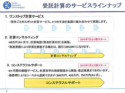 「ユーザーの計算ニーズをさらに掘り起こしたい。半年から1年という継続的な体制で、社内の計算部門と同様の感覚で当社を利用してもらおうという考え方だ。身近な存在として、計算に関するどんな相談にも対応する。基礎となる講習会・勉強会の実施から、具体的なプロジェクト実施前の計算コンサルティング、実際の計算実務、またデータベースやサーバー構築、ツール作成などの周辺業務まで、当社の専門スタッフがフルにサポートする。また、フルサポートの契約に先立って、社内の計算ニーズを洗い出すコンサルティングサービスも合わせて提供していく」