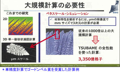 とくに、「K20X」(Kepler)では単精度演算器と倍精度演算器が独立(前世代のFermiは単精度演算器2個で倍精度演算を実行)しているため、単精度演算の有効活用がポイントになる。この点に関し、GSICの松岡聡教授および青木尊之教授は、過去の計算では“念のために”倍精度で計算することが多かったが、最近は単精度計算の活用が目立ってきているとした。精度が問題ないアプリケーションでは、単精度で行うことで2倍以上の性能を引き出せることや、動かすデータ量が半分でメモリーへの負担が少ないことなどが注目されてきているという。実際に、気象予報での気流解析、自動車などの空力特性解析、材料開発分野の凝固成長シミュレーション、地震波伝播シミュレーション、気液界面を含む流れのシミュレーションなど、「TSUBAME2.0」の成果として多くの単精度演算が行われている。