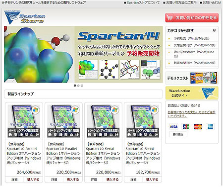 2013.08.24−ウェイブファンクション日本支店は、分子モデリングソフトなどの自社製品を販売するオンラインストア「Spartan Store」を開設した。近日リリース予定の最新バージョン「Spartan '14」もここから予約できる。今後は関連書籍や学生向けの教育キットなど、取り扱い商品を増やしていく。