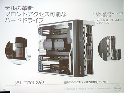 タワー型は、昨年8年ぶりに一新された新シャーシデザインを採用しており、メンテナンス性の高さで高い評価を得ている。とくに「T7610」はシリーズの最上位機種に当たり、1,300ワットの電源を内蔵して、ハイエンドのグラフィックカードを2枚に、GPGPUアクセラレータボードを装着することが可能。また、「T5610」は省スペース型の筐体ながら、「T7610」と同じくデュアルCPU構成をとることができる。「T3610」は「T5610」と共通の筐体でCPUソケットが1つの標準マシンとなっている。