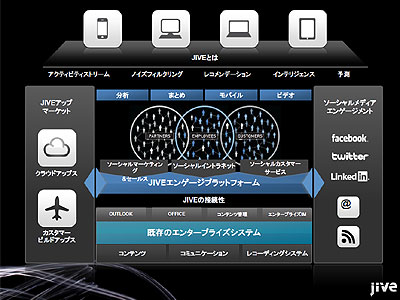 「Jive」は、ソーシャルネットワークを積極的に活用してビジネスの価値を上げ、生産性の向上と売り上げの拡大を目指そうとするソリューション。社内と社外の2つのコミュニティを単一のソフトウエアで連携させることにより、従業員・顧客・パートナーといった関係者間のスムーズな情報共有やコラボレーションを実現する。