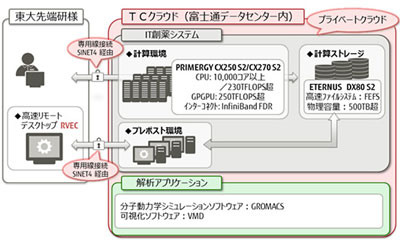 今回の東大先端研は、がんや生活習慣病などを治療する画期的新薬をIT創薬でつくりだす研究を進めており、とくに生体内でのたん白質の振る舞いを解析するシミュレーションで「TCクラウド」を活用する。動かすアプリケーションは、分子動力学法プログラム「GROMACS」と分子グラフィックスソフト「VMD」。どちらも、GPU対応での動作実績があるようだ。