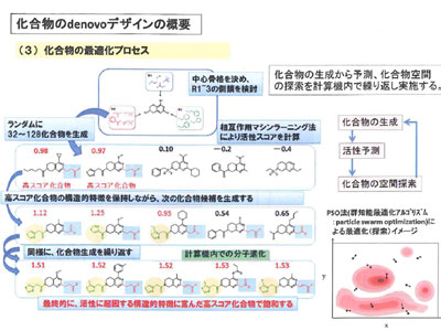 また、薬物として有望な構造を絞り込むためには群知能最適化アルゴリズム(PSO法)を採用。中心骨格に対し、Rグループから任意のフラグメントを当てはめて構造を生成し、活性スコアを計算して上位のものを選び出す。その高スコア化合物の構造的特徴を保持しながら、さらに次の候補群を生成し、活性スコア計算を再度行う。このように多段階的に5千から1万回繰り返すことで、最後には活性に起因する構造的特徴に富んだ候補化合物群を得ることができるという。