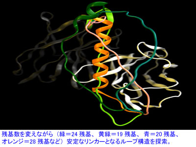とくに、融合たん白質の構築では、リンカーモデリング機能が便利。抗体の重鎖や軽鎖をつなげるリンカーを対象に、残基数を変えながら安定なリンカーとなるループ構造を探索することができる(右写真参照)。同時に、ループアンサンブルにおけるたん白質物性の計算などの機能も強化されている。