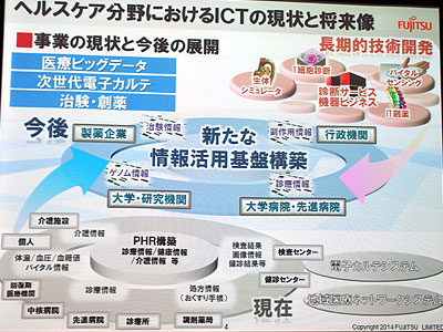 2014.03.19−富士通は18日、ヘルスケア分野のシステム事業を強化し、5年後の2018年度に2,000億円の売り上げを目指す事業計画を発表した。昨年12月にこの事業領域の司令塔となる社長直轄の社内横断組織「未来医療開発センター」を設立しており、次世代電子カルテや医療情報の地域ネットワーク、ゲノム情報と診療情報を統合的に活用する新たな情報基盤づくりなどを進めていく。