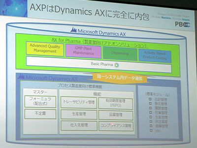 「AX for Pharma」の場合は、ほとんどカスタマイズなしで導入でき、競合他社ERP製品と比べて3分の1から5分の1のライセンスおよび運用コストで済むという。実際のライセンス価格は、ベースの「Dynamics AX」を含めて40ユーザーの場合で約1,000万円。GxPガイドラインに準拠したベーシックモジュール、製薬業向けに機能拡張した品質管理モジュール、GMPプラント保全のためのモジュール、秤量器との連携モジュール、原価管理モジュールを含んでいる。
