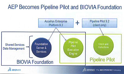 その後、段階的に機能強化され、アプリケーション連携、IT管理、開発環境などのエンタープライズクラスの機能が組み込まれて、旧アクセルリス製品全体の基盤となるプラットホーム製品として発展してきた。とくに、昨年バージョン9に更新された際に製品がサーバー版とクライアント版に分かれ、サーバー版は「Accerlys Enterprise Platform」(AEP)、クライアント版を引き続き「Pipeline Pilot」と呼称するように製品体系が変更された。