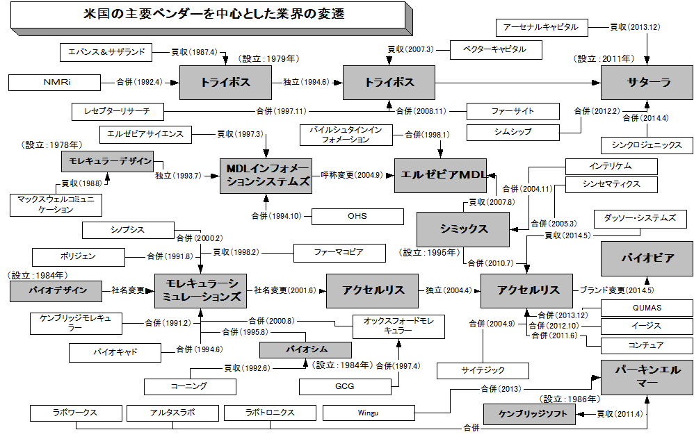 アクセルリスは、計算化学/モデリング系の最大手ベンダーが、情報化学系の最大手として発展してきたMDL−シミックスと統合した存在であり、ダッソーに買収される以前も多くのベンダーを買収し、製品領域を広げていた。現時点で、最も幅広い製品ポートフォリオを持つのがBIOVIAであるといえるだろう。