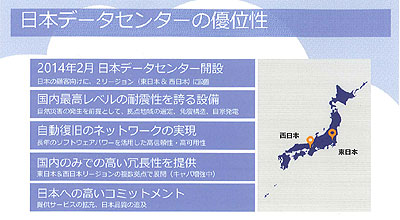 2014.12.17−日本マイクロソフトは16日、法人向けパブリッククラウドサービス「Office 365」を国内のデータセンターからサービス開始すると発表した。東日本と西日本の2ヵ所にデータセンターを置いており、災害対策やセキュリティ面での備えも万全。2月から稼働している「Microsoft Azure」に続いての対応で、来年第1四半期には「Microsoft Dynamics CRM」もこれら日本データセンターからのサービス提供に切り替える。官公庁や医療機関、金融業など、データセンターが国内に立地していることを強く求める顧客の声に応えたもので、今後はクラウド利用が急速に広がると期待している。ビジネスパートナーを2,000社に増やし、多くの顧客の獲得を目指す。