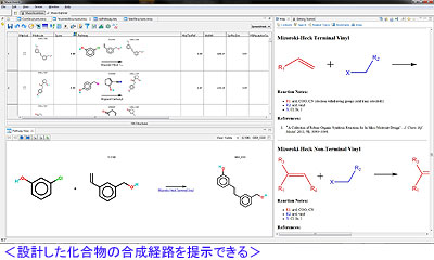 合成経路設計支援システムは、反応スキームを逆にたどる“逆合成”という考え方のもとに前駆体を予測するシステム。1980年代を中心に欧米でいくつもの研究組合が組織され、盛んに開発が試みられたが、当時は製品レベルのシステムは完成しなかった。その後も若干数のプロジェクトは継続し、一部に製品化されたシステムもあるが、広く普及するには至っていない。今回の「Muse Invent」に搭載された合成経路設計機能がどのように進歩したものであるか、またその実用性に関する反響が期待されるところだ。