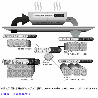 2015.03.28−日立製作所は26日、東京大学医科学研究所において、ヒトゲノム解析用の新型スーパーコンピューター「Shirokane3」が4月1日から稼働すると発表した。理論最大性能は422テラFLOPSで、従来機に比べて約10倍の速度でヒトゲノムのデータ解析を行うことが可能。ストレージも拡張され、約100万人分のデータを保存することができる。これにより、ゲノムの変異した箇所を高速に検索・特定し、その変異と疾患との因果関係の分析や、治療効果の高い医薬品の予測を行うことなどが可能になる。