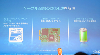 また、もう一つの新ワイヤレス技術が「インテル・ワイヤレス・ドッキング」。これは、同社のワイヤレス・ギガビット技術に基づくもので、PCを持ったユーザーがデスクに近づくだけで、自動的にモニター、キーボード、マウス、USB機器が認識・接続され、着席と同時に仕事ができるようになる。このため、デスクに従来のようなドッキングステーションは不要。これまでは、座席が自由なオープンオフィス環境でも、社員が使用するPCの機種に合わせたドッキングステーションを複数準備しなければならないことがネックになるケースが多かったという。
