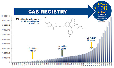 REGISTRY」は、網羅する物質数や信頼性の観点から世界中の化学・製薬企業、大学・政府機関・特許発行機関などに認められた世界最大の化学物質データベース。CAS登録番号を正確に知ることのできる情報源として利用されており、有機および無機物質の登録件数が1億件を突破した。この中には合金・配位化合物・鉱物・混合物・ポリマー・塩なども含まれており、この1億件のほかに6,600万件のタンパク質や核酸などの配列情報が収録されている。