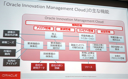 さて、今回の新製品である「Oracle Innovation Management Cloud」は、エンジニアリングチェーンを構成するPLM(製品ライフサイクル管理)領域のシステムで、欧米でも提供されてまだ日が浅いが、すでに10社以上が採用し、5万人のユーザーが使い始めている。市場や顧客ニーズを収集・体系化し、ニーズと自社の持つ技術要素への紐付けを行い、製品コンセプトをまとめ、収益性なども考慮して企画案を練り上げていく過程をまとめて支援することができる。