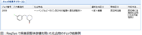 RegSysは、覚せい剤取締法や麻薬・向精神薬取締法をはじめ、薬機法の指定薬物、毒物及び劇物取締法の特定毒物、労働安全衛生法や化学兵器禁止法で規制されている物質などを化学構造式でチェックするシステム。有機合成実験の際に反応式などを記述する電子実験ノートブック(ELN)と連携して使われることが多く、実験計画を入力した段階で反応物や生成物、中間体などに該当する物質がないかを判定することができる。