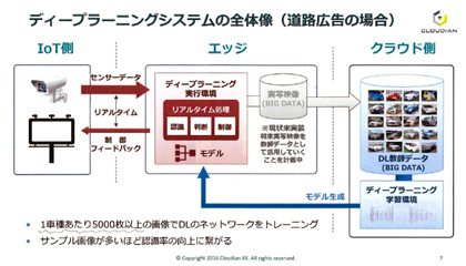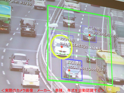 実証実験では、六本木の大型LED広告塔にビデオカメラを設置し、首都高速3号線を走行する車の中から指定された車種を見分け、高級車・ファミリーカーなどの分類に基づいて、表示させる広告を切り替えることを行った。走行車種を自動認識する技術として、ディープラーニング(深層学習)を利用し、300車種以上、1車種当たり5,000枚以上の画像を学習させ、2〜3カ月かけて認識モデルをつくり上げた。