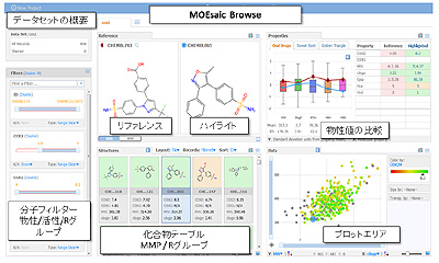 機能面の強化としては、MOEsaic関連が大きい。これは、MOEのウェブインターフェースを用いて、化学データを表示・解析・デザインするSAR用アプリケーションで、メディシナルケミストが直観的に扱えるように、部分構造・類似構造検索、化合物アラインメント、フィルタリング、プロット表示、Rグループ解析、MMP(マッチドモレキュラーペア)解析などの機能を統合したもの。