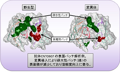 さらに、タンパク質の会合に関係する疎水性表面・荷電表面パッチの可視化機能を刷新した。これまでのタンパク質表面解析では、疎水性・親水性領域や、正電荷・負電荷領域が表面上に広がってしまい、どこが重要な部位かを検出するのが難しかった。新しい表示は、より高い物性値を示す領域のみを際立たせるため、どこに変異を導入すれば溶解度を向上させられるかなどの検討を簡単に行うことができるという。