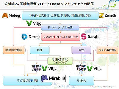 英Lhasaはこのためのスイートを開発。検出された不純物が変異原性化合物かどうかを調べるため、既知の情報から調査する毒性試験情報データベース「Vitic Nexus」、未知化合物の毒性を予測するソフトとして知識ベースの「Derek Nexus」と統計ベースの「Sarah Nexus」を提供している。