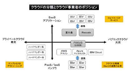 一方、パブリッククラウドでもシングルテナントと呼ばれ、特定の環境を1社で専有できる場合もあるが、多くのユーザーがシステムを共用するスタイルが基本である。種別としてIaaS(サービスとしてのインフラ)、PaaS(サービスとしてのプラットホーム)、SaaS(サービスとしてのソフトウエア)などに分類される。