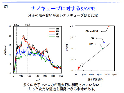 この結果から、高い熱安定性を示すナノキューブは、面間距離が1オングストローム以下の接触面積の割合が高いことがわかった。2.8オングストロームの距離では疎水効果が大きく働くが、それより狭くなるとこの効果がなくなり、vdW力(距離の6乗に反比例)が1オングストローム以下の面間距離で最大化されると考えられるという。これまで、水中における分子複合体の安定性に関して、疎水効果とvdW力の寄与を分割することは難しかったが、SAVPRによってvdW力を半定量的に評価することが可能。また、SAVPR解析は計算コストが高くないため、産業界などで応用しやすいことも利点になるという。