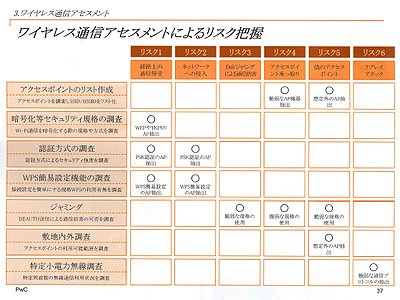 今回の同社の「ワイヤレス通信アセスメントサービス」は、専門家がワイヤレス通信の利用状況を現地で調査し、通信の暗号化規格や認証方式、接続設定などの把握に加え、使用されないまま放置されているアクセスポイントの抽出、電波の到達範囲の調査などを実施。十分なセキュリティ強度が確保されているかを検証し、セキュリティ対策における課題を明確にする。