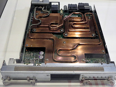 今回公開されるのは、ポスト「京」のCPUと、それを搭載した計算モジュール、専用ラックの3つ。目をひくのはモジュールのコンパクトさで、見たところ約30センチ×25センチほどの大きさであり、「京」のモジュールと比べて大幅に小さい。1枚にCPUが2個載っているが、メモリーやインターフェース系の回路もCPU上に実装されているため、これだけコンパクトに仕上がっているようだ。