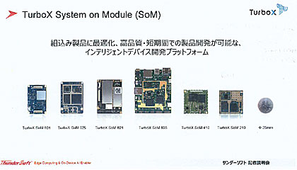 とりわけ、日本市場とのからみでアプリケーションとして狙っているのが“スマートIoT”の分野。すでに「TurboX」と呼ぶソリューションを開発ずみで、組み込み製品に最適化し、高品質・短期間での製品開発が可能なシステムオンモジュール(SoM)を提供している。AI機能を搭載できる大小さまざまなコアモジュールを用意しており、スマートIoTデバイス開発に利用することが可能。クラウドを含めたトータルパッケージで製品化している。