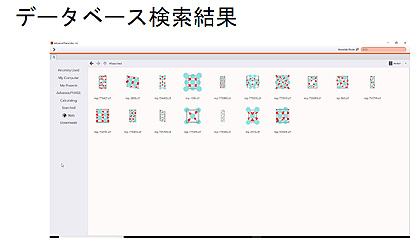 「Advance/NanoLabo」自体の機能としては、まず無償で利用できる材料データベースであるMaterials Project(米MITが公開しているMI向けデータベース)およびPubChem(米NCBIが提供する化学物質データベース)に接続して構造検索を行う機能がある。取得したデータは、それに含まれる結晶構造がアイコンで表示されるため、ファイルを開かなくても中身がわかるように工夫されている。