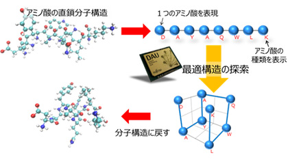 具体的に、タンパク質由来の創薬シミュレーターを開発している加プロテインキュアと共同研究を実施。中分子創薬では、数個〜50個ほどのアミノ酸が鎖状につながった中分子化合物が、標的となるタンパク質に強固に結合することで医薬としての効果を発揮する。そこで、各アミノ酸をモデル化し格子点上に配置した場合に、どの構造が最も安定的かをアミノ酸同士の結合関係などからデジタルアニーラで探索。そして、アミノ酸構造と標的タンパク質との結合の強さをドッキング計算で調べていく。このフローを1,000回ほど繰り返すことで、薬効の高い中分子医薬候補化合物を探索する。