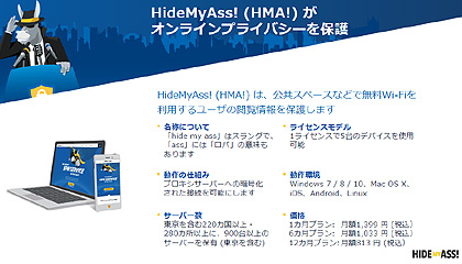 2018.11.17−個人向けセキュリティソフト会社のAvast Software Japanは15日、パソコンやタブレットで公衆無線LANを安全に利用するための仮想プライベートネットワーク(VPN)製品「HideMyAss!」(HMA!)を国内で本格的に発売すると発表した。世界220ヵ国以上、280ヵ所以上に900以上のサーバーを置いており、セキュリティが不安な国に旅行したとしても安全な通信が確立されるという。Windows、Mac、iOS、Android、LinuxとOSを選ばずに、1ライセンスで5台のデバイスを利用できる。