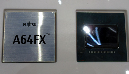 このCPUを2個搭載したCPUメモリーユニットはポスト「京」の心臓部となるもので、展示されているものは昨年と同じ試作品。同ユニットを挿入する専用ラックは表と裏が背中合わせで1体の構造で、1列48枚が表と裏に2列分ずつ(計4列)入ることになり、トータルでは192枚/384ノード(1CPU/1ノードのため)がラック当たりの最大構成。