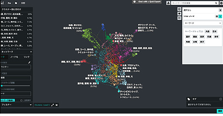 実際にどんなテキストでも扱うことができ、標準で提供されるニュース(150万件)、企業概要(1,000社)、特許(8,000件)のほか、ソーシャルメディア、各種掲示板、企業評価のフィードバック、CRM(カスタマーリレーションシップマネジメント)に記入されたコメント、カスタマーサポートの履歴、各種調査レポート、学術論文など大量の文章を“読み”、内容によって自動的に分類(クラスタリング)し、文書間の関連をネットワークビューとして可視化することができる。
