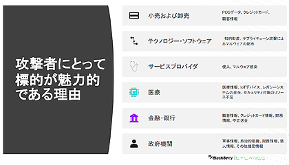 APTで標的にされる業種はさまざまだが、攻撃者は知的財産を盗むことを目的としており、4分の1以上(26%)のランサムウエアの被害者はテクノロジー企業だった。また、ヘルスケア関連も標的で、医療データは重要性が高いため、他の業界よりも身代金を支払う傾向があったという。膨大な個人情報を保持している官公庁への攻撃も多い。国家の重要インフラに対する連鎖的な影響のみならず、個人への影響も大きいため深刻度が高い。個人情報を盗むという意味では、小売業や金融業も主要な標的となっている。医療機関などでは、セキュリティ的に脆弱なレガシーシステムが使われていることもあり、セキュリティ対策のリソースも不足している。現在、新型コロナウイルス感染症拡大で世界中の医療機関はひっ迫しているが、同社では「サイバー犯罪者には良心はない。むしろ絶好の機会だと考えているだろう」とコメントしている。