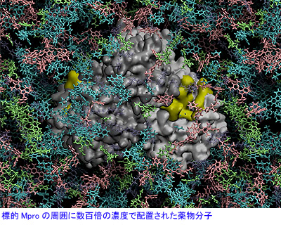 今回の研究は、抗ウイルス薬に限らず2,128種の既存医薬品の中から治療薬候補を探そうというもの。4種類の標的タンパク質に対して網羅的にドッキングシミュレーションを行っており、今回はその1つであるメインプロテアーゼ(Mpro)に対する結果を公表した。
