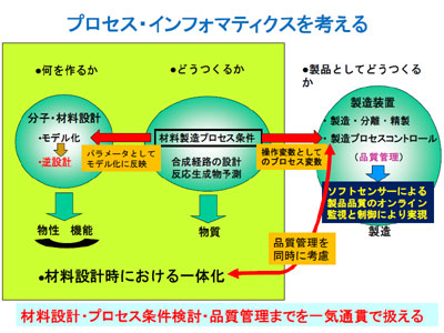 「冬の時代もあったが、先見性のある会社も多くて、この40年近くにわたって継続的に共同研究を続けてくることができた。その経験から強く感じるようになったことは、材料というものは原料が同じでも実際につくると違うものができるということ。これは、食材が一緒でも、どう料理するかで仕上がりが変わるのと同じで、つくり方、つまりプロセス条件のパラメーターが変わってしまうのが原因だ。そこで、何をつくるかを考える際に、どうつくるかも一体的に検討しなければならない。このことを、プロセスインフォマティクスという概念として私が世界で初めて提唱した」