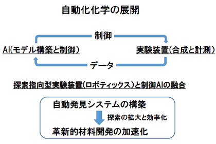 「探索指向型実験機器とAIが融合した“自動化化学”ともいうべきものが実現すると思う。探索に適した合成装置(計測も含めた)を用意し、制御AIと組み合わせることで、ベイズ最適化を使いながら探索範囲を自動的にどんどん広げていく。例えば、ベイズ最適化で次に行うべき実験条件が提示されたとしても、いまは実験研究者がうーんそれはいやだなと思ったらやらない。AIとロボットであれば黙ってやるので、部分的に遠回りにみえても、結局は短時間で最適な解を導いてくれる。実験結果をモデルにフィードバックして、自律的に次の合成を仕込んでくれるので探索範囲が自動的に広がって、いろいろな種類の候補物質が提案されるようになるだろう」