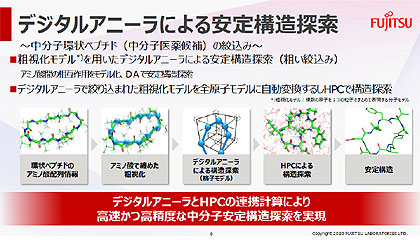 今回の共同研究は昨年9月から開始されたもの。富士通の「デジタルアニーラ」は、量子現象に着想を得て、組み合わせ最適化問題に特化したマシンで、この種の問題であれば通常のコンピューターをはるかに上回る性能を発揮することができる。共同研究のテーマを、環状ペプチドの最安定構造探索とし、「デジタルアニーラ」でこの問題を扱うための技術開発を進めた。
