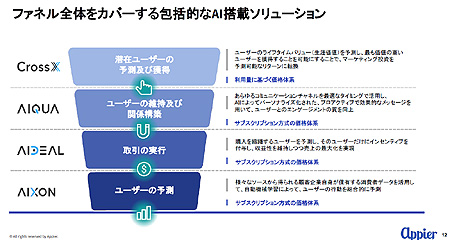 主にB2C企業に対してSaaS型のサービスを提供するのが同社のビジネスモデルで、とくに消費者のオンライン上での振る舞いを予測するAI技術を強みとしている。どこに良い顧客がいるのかを探る「CrossX」、顧客との関係性を強化する「AIQUA」(アイコア)、実際の購買行動を促す「AIDEAL」、次の購入につながる行動を予測する「AIXON」(アイソン)といった製品を提供している。