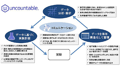 今回の「Uncountable」は、電子実験ノート機能を中心に、データ解析・分析機能、機械学習モデルによる配合レシピ推奨機能を合わせ持つデータマネジメントプラットフォームで、蓄積した実験データをもとに実験計画を立案し、新たな実験データを取得した上で解析・分析を加えるという一連のサイクルを実現。さまざまなパラメーターについてユーザー自身がマスター設定(原料、比率、条件等)し、配合レシピが完成すると、そのまま実験指示を実施し、トラッキングも可能。実験データや実験指示書、レポートなどの情報を一元管理できるので、研究者間の情報共有の促進にも役立つ。